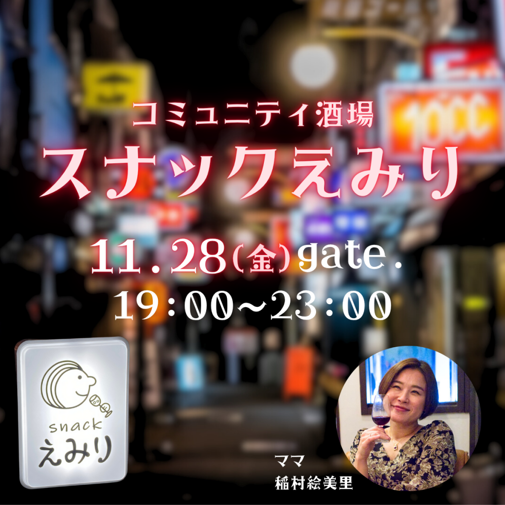 酒が好きなママと、みんなで愉快な時間を過ごす、コミュニティ酒場「スナックえみり」を開催します。スナックえみりは本物のスナックではなく、交流を楽しむイベントの名称です。